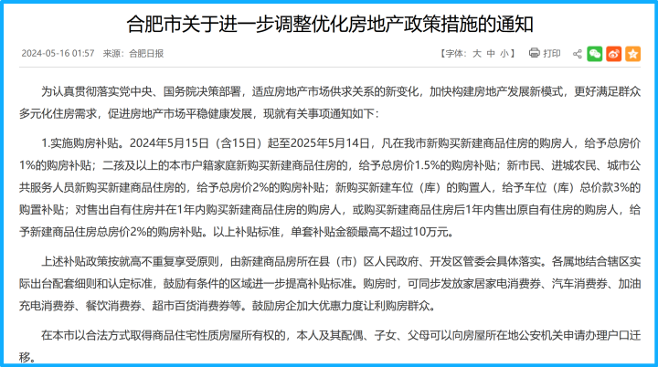 合肥2024年5月发布的《合肥市关于进一步调整优化房地产政策措施的通知》中,第三条 “促进二手房市场流通”与第四条“支持卖旧买新”,便针对性提出了具体举措: