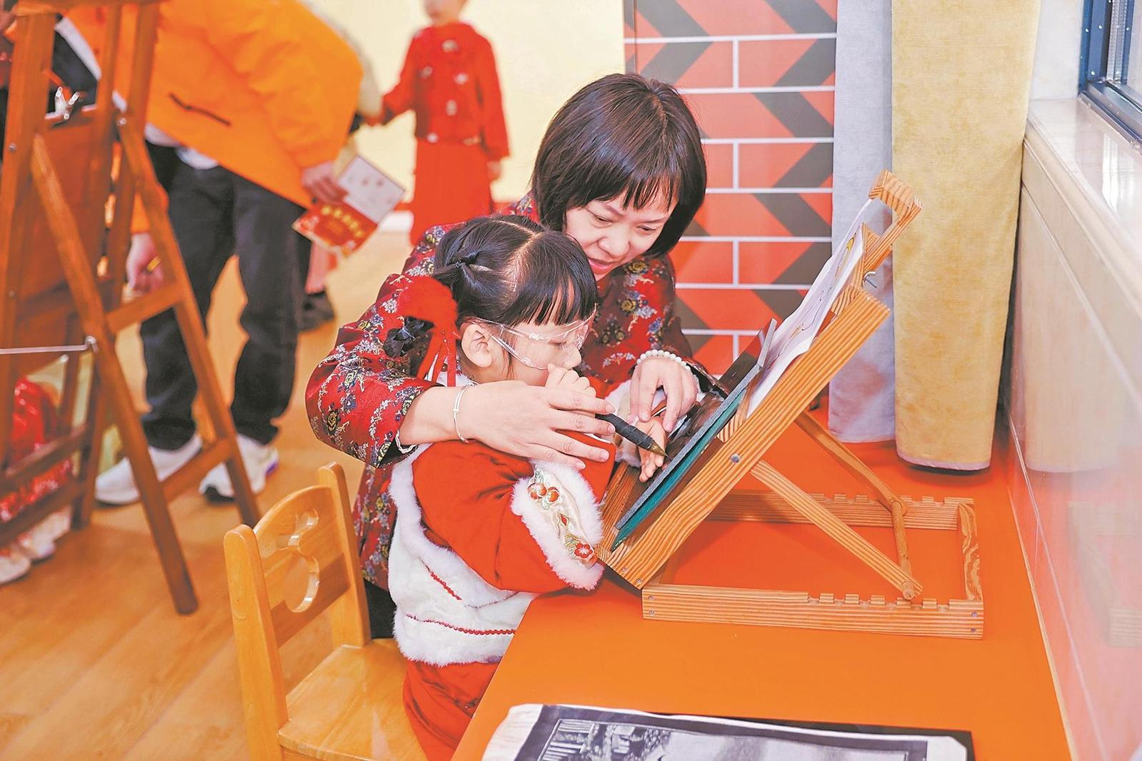 非遗进校园活动中,雕艺大师指导孩子们体验漆线雕。