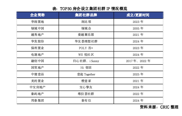 截止到当前,43%(13家)的TOP30房企由总部牵头,从集团层面发布了统一的社群运营品牌。不仅如此,这些社群运营已经逐步具备了真正意义上的社群概念,开始去中心化运营,部分成员自主发起活动;打破了业主与非业主的界限;且强调情感属性,通过共同兴趣与价值观连接。比如2023年华润置地在集团层面推出了“润比邻”,2024-2025年有华发、中交地产和中建壹品新成立了“华友荟理想社群”、“交心挚友”和“壹起Together”等。