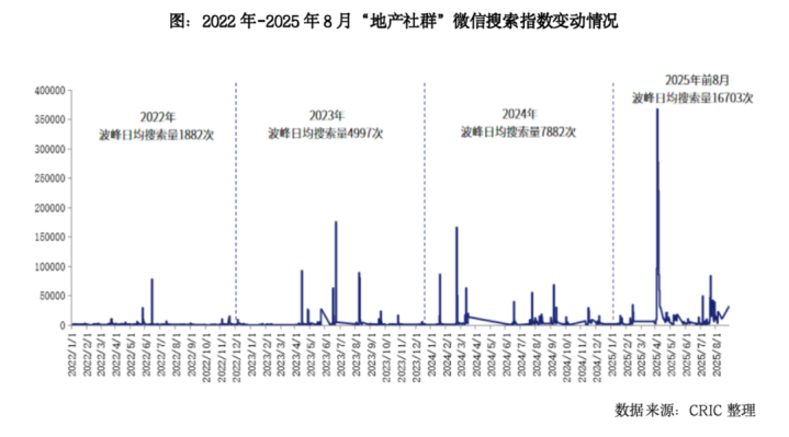 近年来,地产社群运营正被越来越多的房企关注,其热度呈现爆发式增长。从“指数”来看,“地产社群”关键词的日均搜索量从2022年的1882次快速上升至2025年1-8月的16703次,增长近10倍,并在2025年4月3日达到单日367932次的历史峰值。单从这一指标来看,地产社群运营正在被越来越多的企业看到。