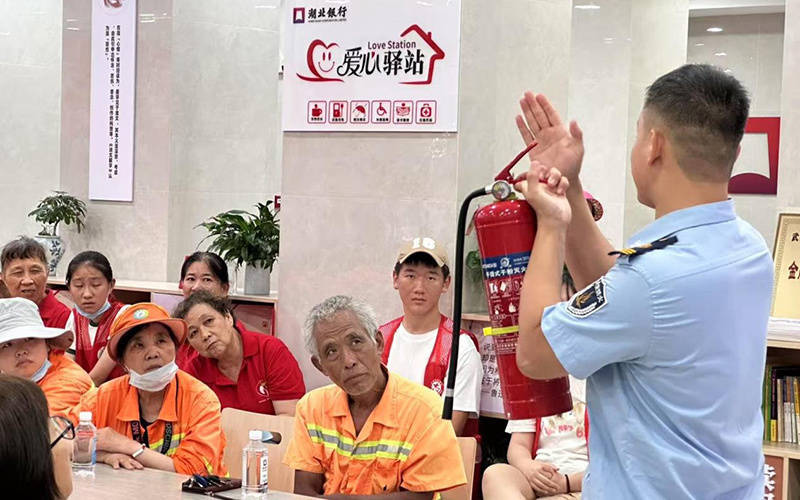 环卫工走进湖北银行爱心驿站听高温作业、火灾防护课。