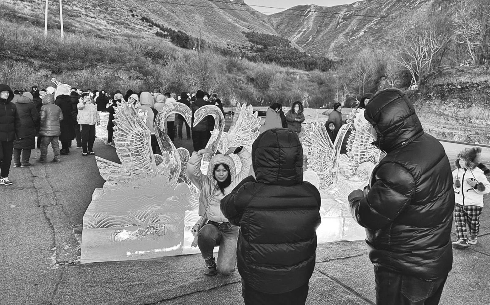 “昂首的玉龙,象征着咱们朝阳昂扬奋进的发展态势;翩跹的天鹅,是咱朝阳季节性生态旅游的闪亮名片;鱼跃龙门,祝愿朝阳的发展节节攀升、蒸蒸日上;双马奔腾,则是祈盼大家在新的一年里马年吉祥、万事顺遂。”展会负责人武兴文手持话筒,热情地向游客讲解着每一件冰灯作品背后的文化内涵,让这场冰雪盛宴更添人文温度。